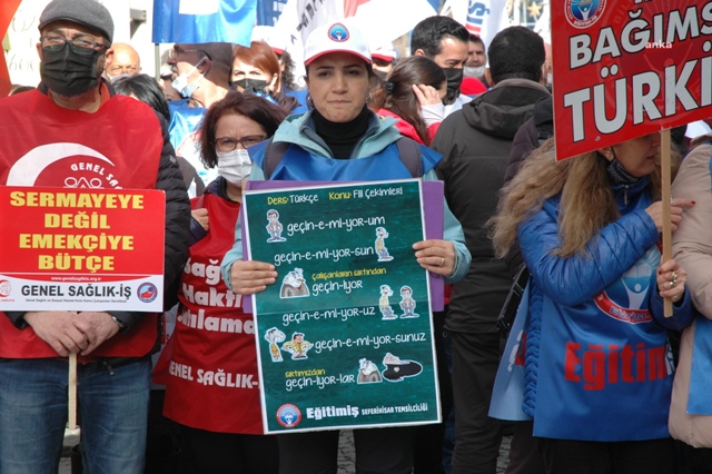 Cangı, “Aylardır haykırıyoruz. ‘Geçinemiyoruz’ diyoruz. Memur aç, yoksul. Memurun alım gücü düşmüş. Bugün saraylara teşekkür etmeye gidenlere alanlardan sesleniyoruz. Biz kazanacağız. Laik, bilimsel eğitim, kamusal eğitim kazanacak. Korku duvarları yıkıldı” dedi.