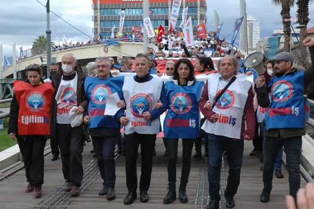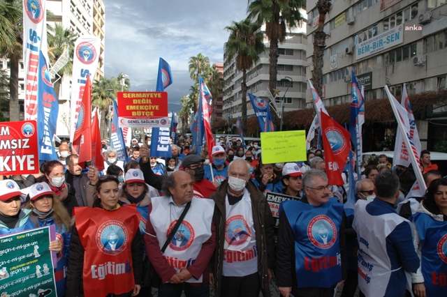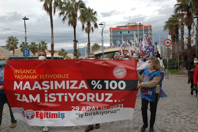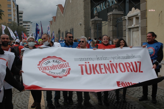 Eğitim İş Sendikası’nın, Türkiye’de bir günlük iş bırakma kararı sonrası İzmir’de öğretmenler alanlara indi. Konak’ta toplanıp eski Sümerbank önüne yürüyen öğretmenler, “Sermayeye değil, emekçiye bütçe”, “Emeklilikte insanca yaşam her öğretmenin hakkıdır”, “Enflasyon rakamlarından payımıza açlık, yoksulluk, sömürü düştü” yazılı dövizler taşıyıp, “Mustafa Kemal’in öğretmeniyiz”, “Zam zulüm işkence işte AKP”, “Saraylar sizin, alanlar bizim” sloganları attı.